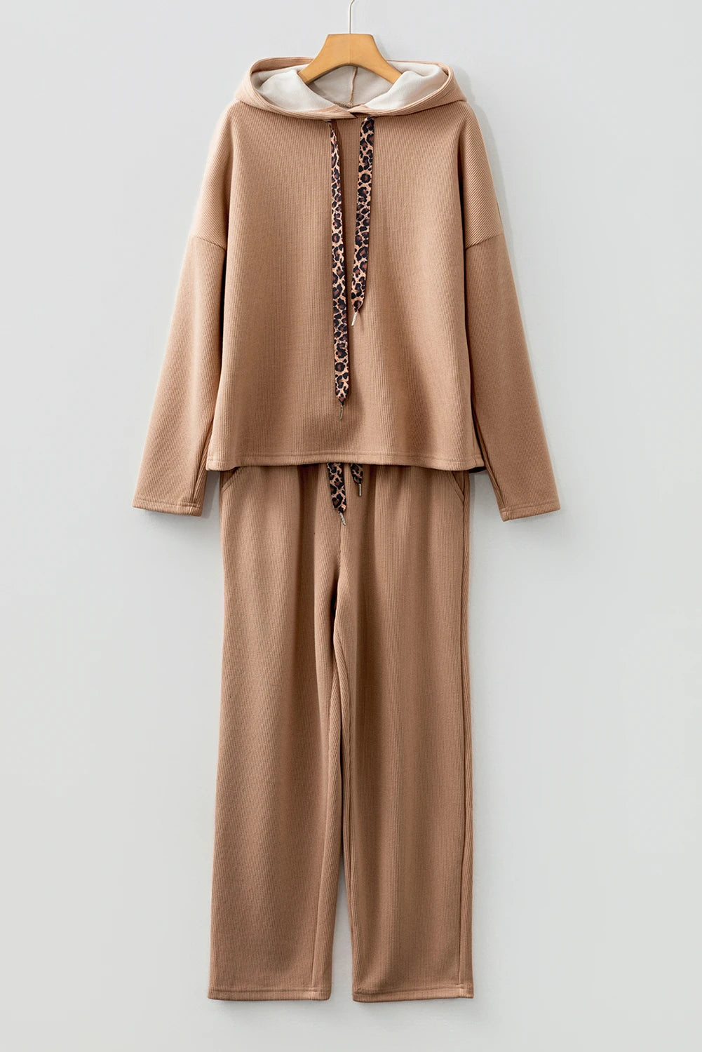Stay comfy with a little wild flair in the Wild & Cozy Cord Set. This two-piece corduroy ensemble features a soft pullover hoodie with lace-leopard drawstring accents for the perfect pop of chic detail. The relaxed, drop-shoulder hoodie pairs effortlessly with high-waisted tapered pants, giving you a coordinated look that’s equal parts stylish and snug. Made from a luxe, stretchy blend, it’s the easy outfit you’ll reach for whether you're lounging, running errands, or heading out feeling cute and cozy.