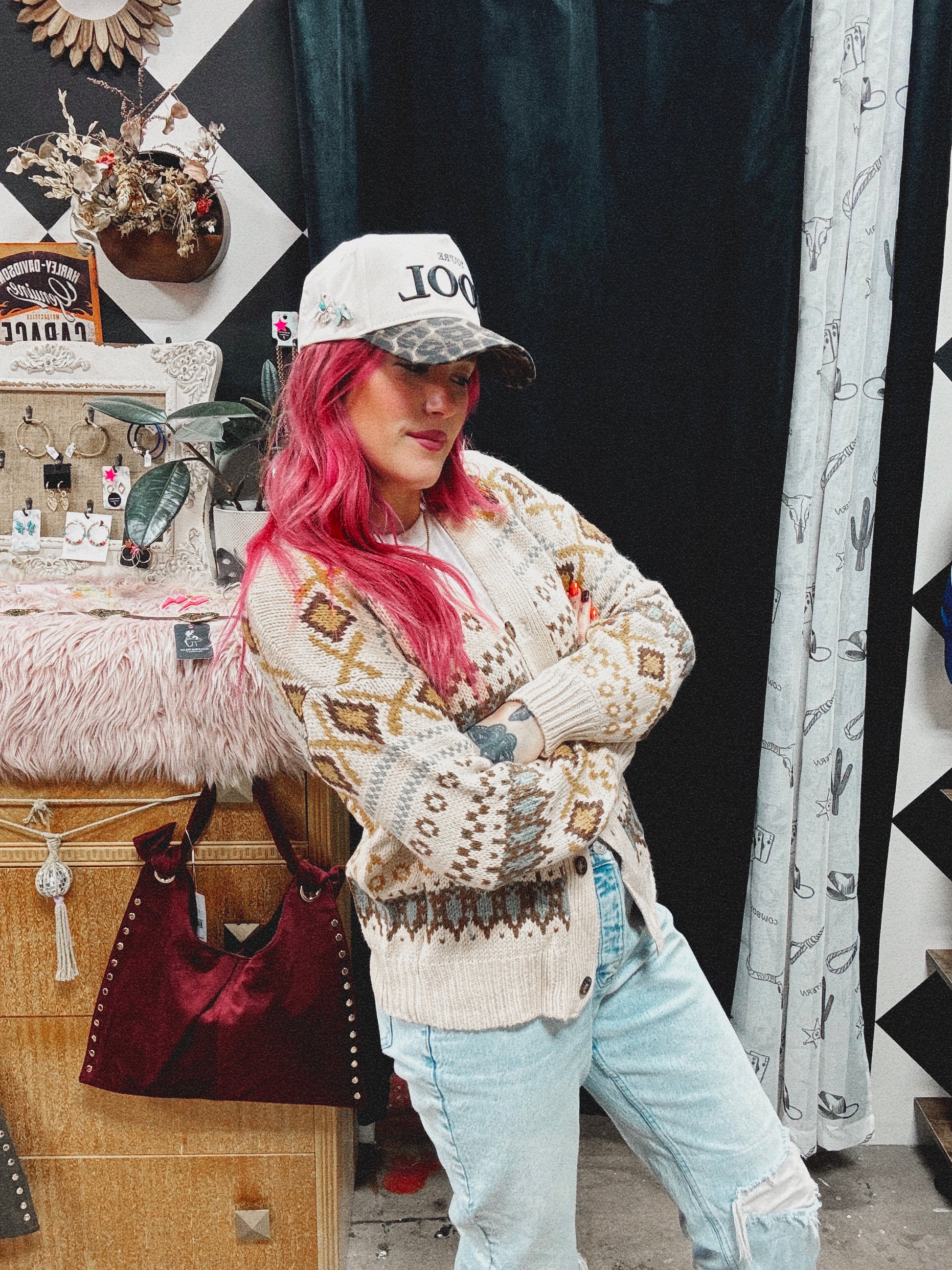 Bring a touch of western charm to your wardrobe with the Cowgirl Cozy Cardigan. Made from a soft, warm blend of acrylic and polyamide, this button-up V-neck knit is perfect for layering over your favorite tees or turtlenecks. The playful Aztec-inspired pattern adds a boho-cowgirl twist, while the relaxed fit keeps it effortlessly comfy. A must-have for chilly days when you want style that’s both cozy and cute.