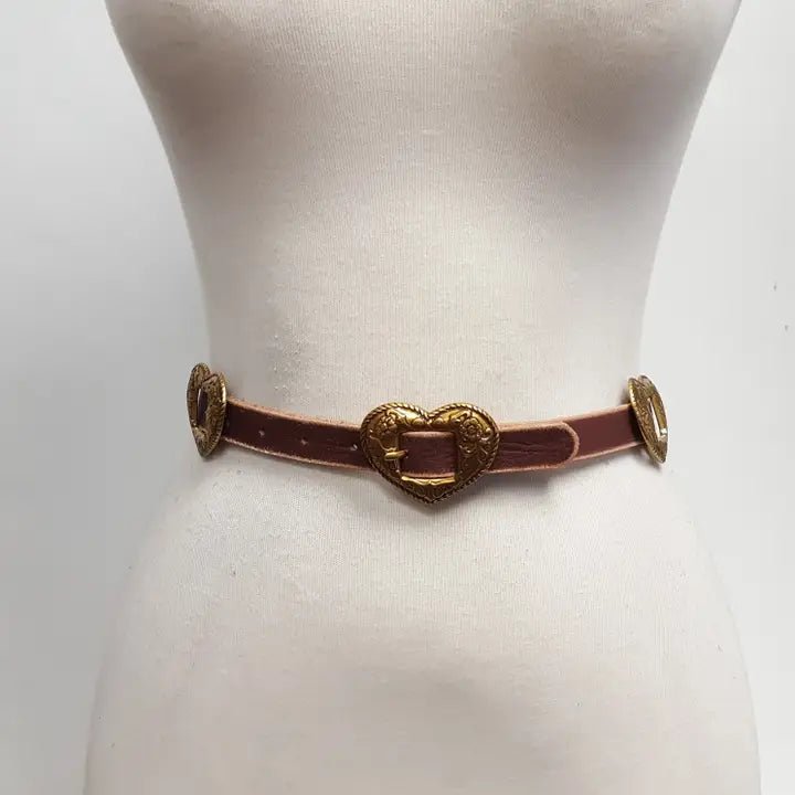 Matte Silver or Vintage Gold metal finish on the buckle and matching conchos Dimension of buckle is 2.35" x 1.7" Rope edge detail and floral etched on each metal buckle and concho One buckle plus 5 conchos, total 6 hearts on the belt Width is 3/4". Leather is 100% genuine leather, in Vintage , edge distress hand finish in black Measurement as follows: S/M: Start of leather to 1st hole 30", to middle hole 32",to last hole 34" to the tip end(total length) is 38" M/L: Start of leather to 1st hole 34", to middle hole 36",to last hole 38" to the tip end(total length) is 42" L/X: Start of leather to 1st hole 38", to middle hole 40" to last hole 42" to the tip end(total length) is 46"
