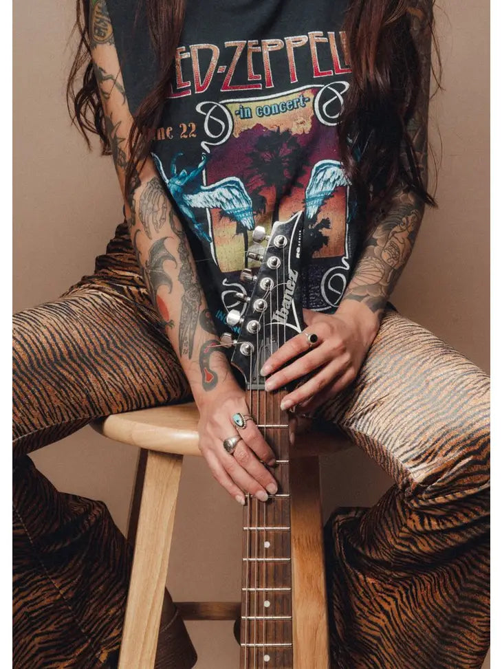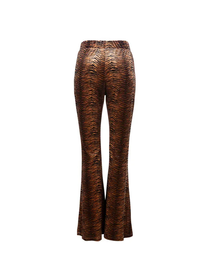 Your style will be roaring with fierceness in these tiger pattern flare pants that amp up any outfit! Made from lush animal print velvet, these pants are fitted through the hips and thighs before breaking into a flare with '70s-era attitude. The bell bottoms pants have a pull-on elastic waistband with stunning black lace up details. The eye-catching tiger print gives these flares a wild look! Made out of 95% polyester and 5% spandex. Available in sizes S, M, L and XL. Show off those legs in these rocker-chic bell bottom pants that are an instant fave!