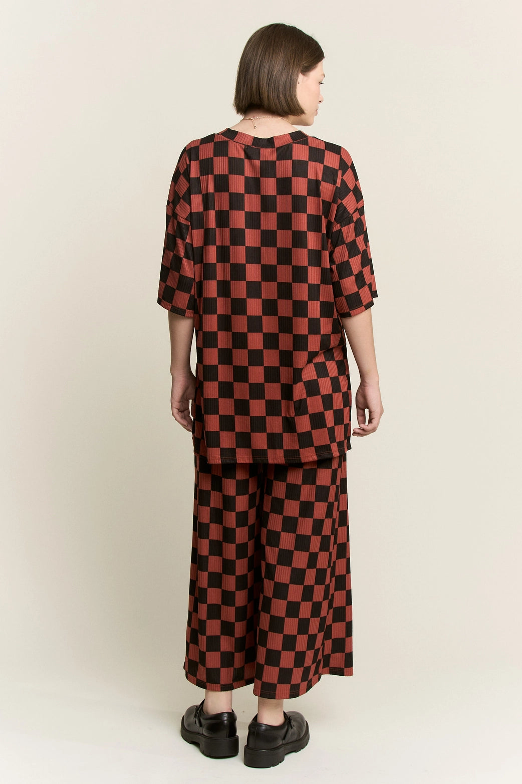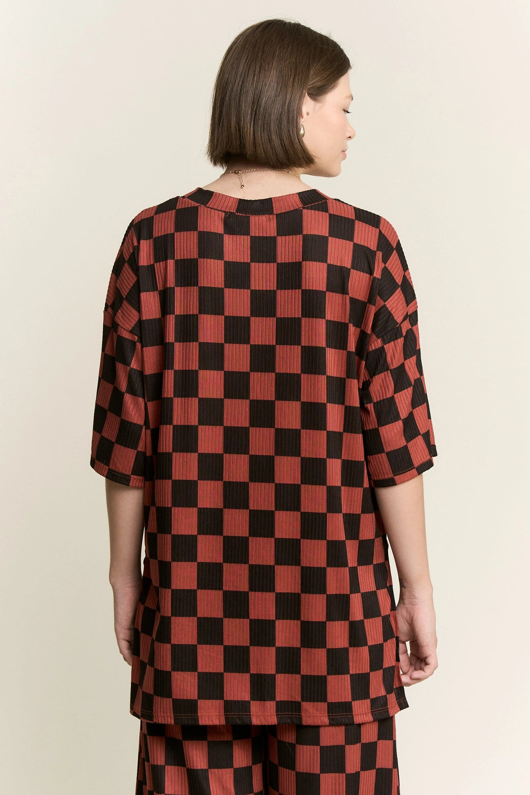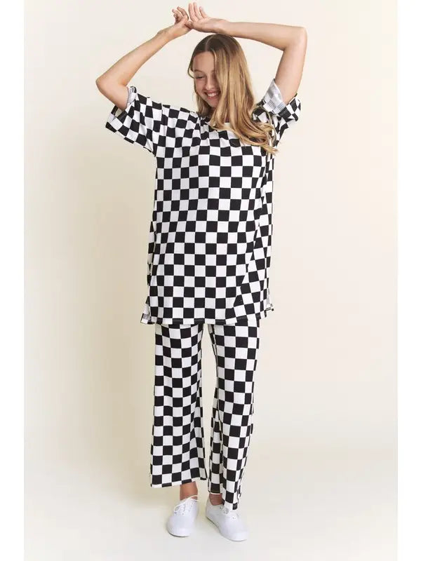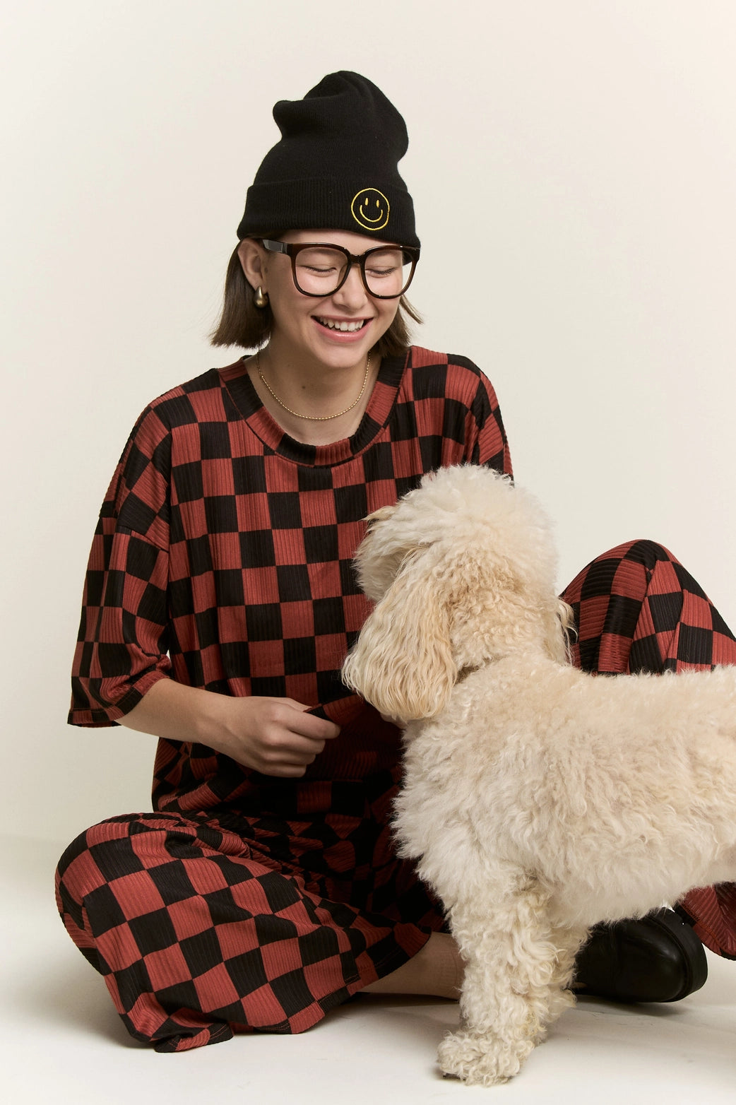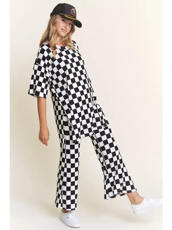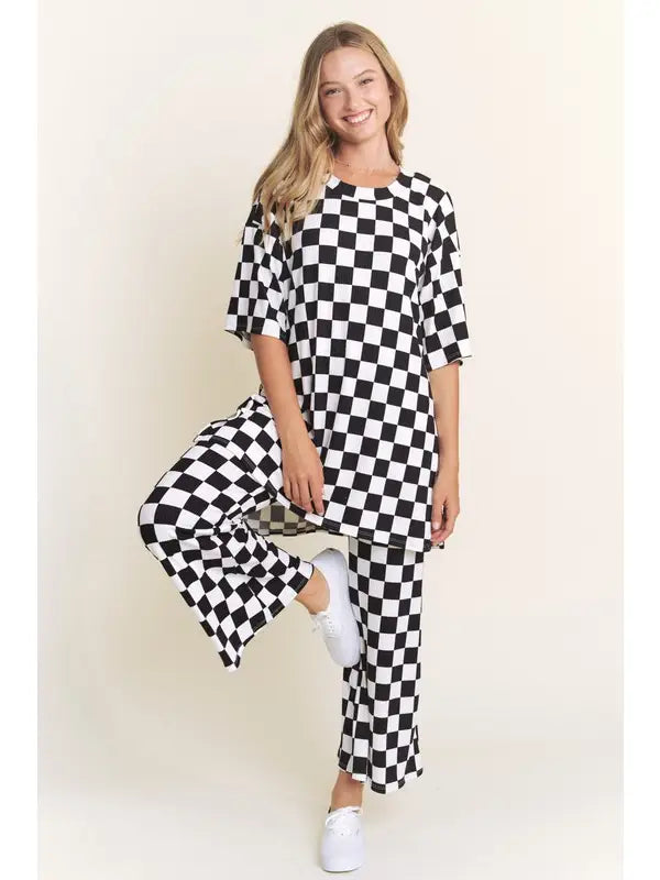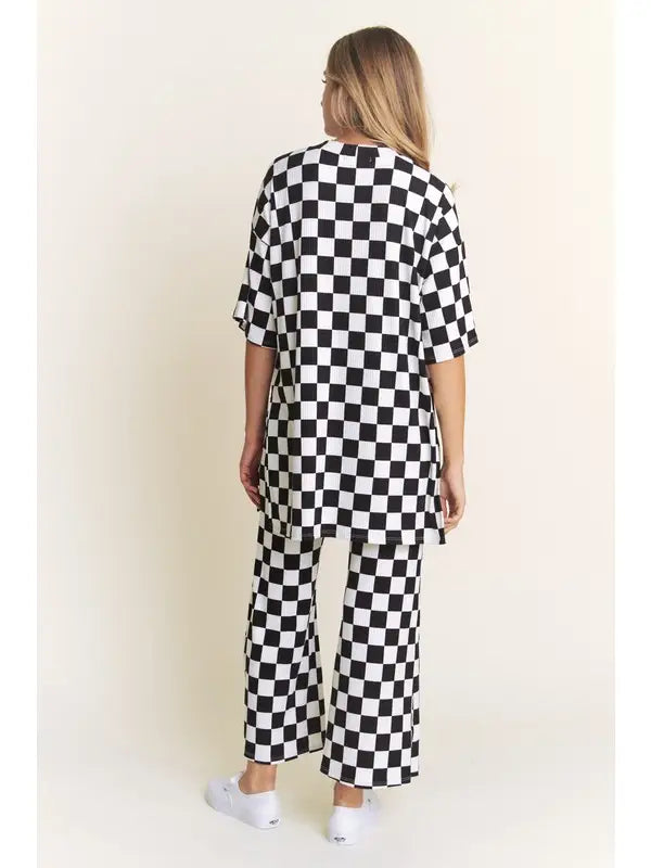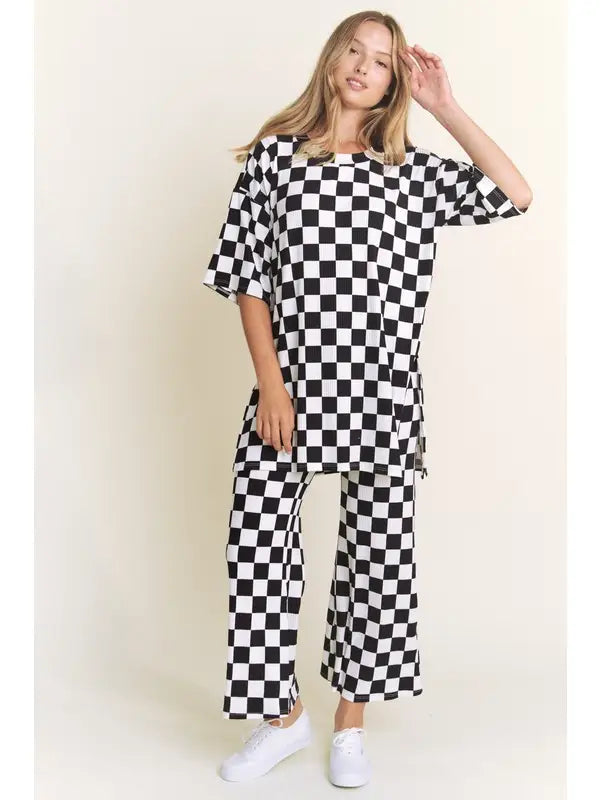 Two pieces. One attitude. The Riot Doll Set is your instant outfit with zero rules attached. Made from a stretchy ribbed knit in a bold checkered print, this set balances comfort with straight-up streetwear edge. The oversized long-body top features a classic round neckline, half sleeves, and side slits for movement and layering freedom. Paired with straight-leg pants designed with a comfy elastic waistband and functional side hip pockets, this set is built for all-day wear without sacrificing style. Rock it together for a full statement or split it up—either way, it’s effortless chaos done right. 🖤🔥