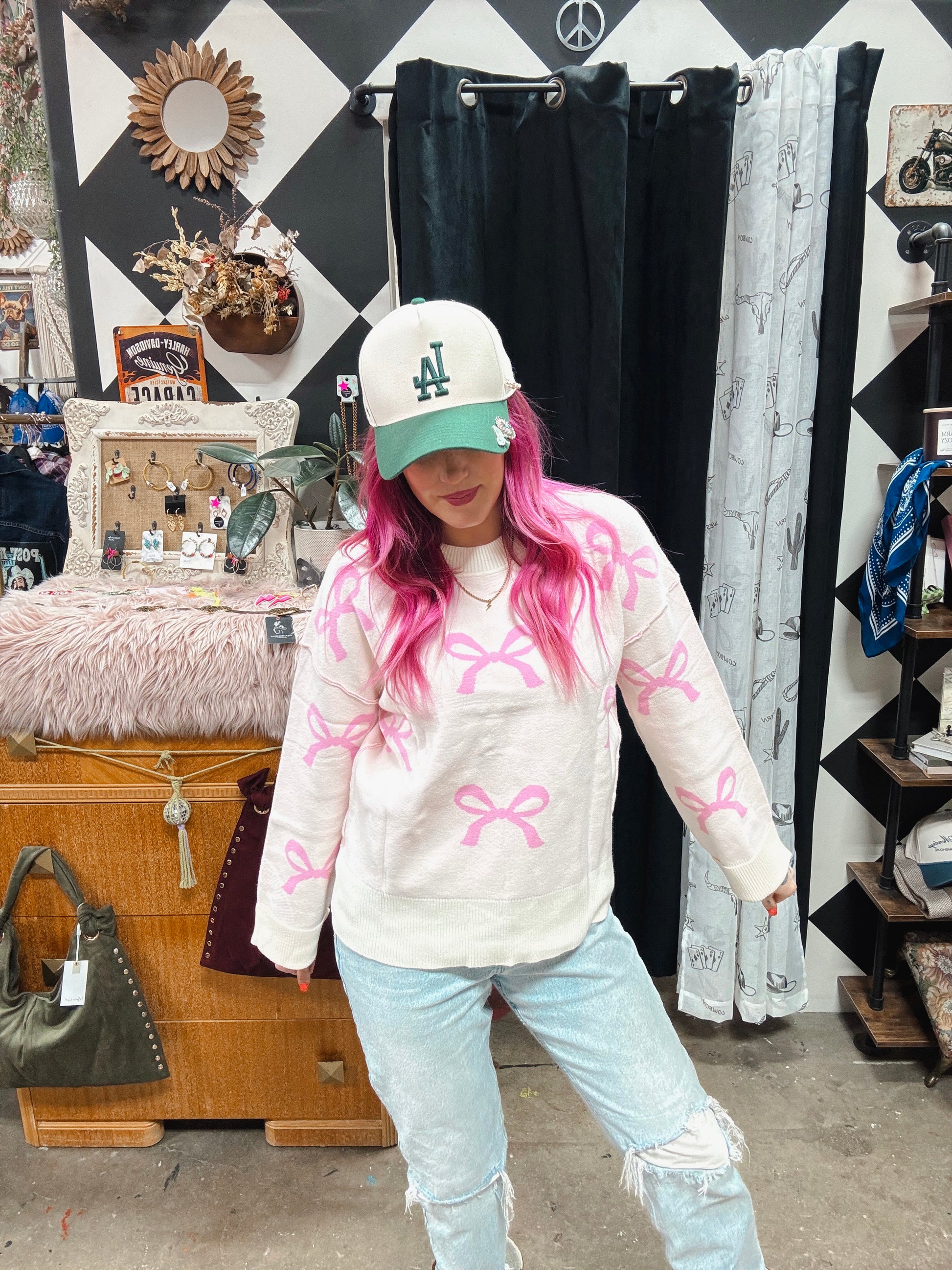 Sweeten up your holiday style with the Sugarplum Bow Sweater. Made from a soft, cozy blend of viscose, polyester, and polyamide, this sweater features an adorable bow pattern that’s perfect for the festive season. Its loose fit flatters every figure, while ribbed trim keeps the shape just right. Finished with drop shoulders and exposed seams for a relaxed touch, this sweater is as charming as it is comfy—ideal for holiday parties or cozy nights in.