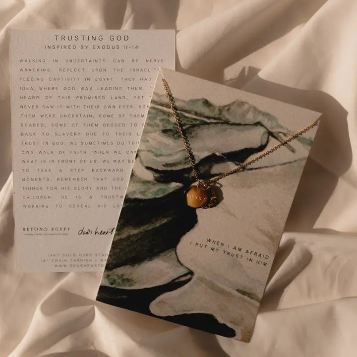 Trusting God Inspired by Exodus 11-14 Walking in uncertainty can be nerve wracking. Reflect upon the Israelites fleeing captivity in Egypt. They had no idea where God was leading them. They heard of this promised land, yet they never saw it with their own eyes. Some of them were uncertain, some of them were scared, some of them begged to return back to slavery due to their lack of trust in God. We sometimes do this in our own walk of faith. When we cannot see what is in front of us, we may be inclined to take a step backward. In those moments, remember that God works all things for His glory and the good of His children.He is a trustworthy God, working to reveal His love for you. Details in the Design:This piece has two discs-one in the front that looks like sand dunes while the smooth disc has the word "TRUST" engraved on it to remind us to trust in God. 18" Adjustable Chain 14kt Gold over stainless steel Tarnish + Water Resistant pendant measures a little over 1/2" in diameter